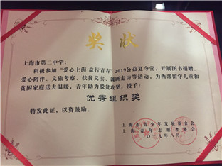 2019年暑期,上海市第二中学近30名志愿者赴云南元阳参加“爱心上海 益行青春”公益夏令营,开展图书馆捐赠、爱心陪伴、文旅考察、扶贫义卖、调研走访等活动,青年助力脱贫攻坚,为西部留守儿童和贫困家庭送去温暖。上海市第二中学荣获“优秀组织奖”,由市二志愿者领衔的“不二队”荣获“最给力公益众筹奖”、“哆啦A梦队”荣获“最佳爱心陪伴奖”,干一晨同学荣获“最有责任感新闻奖”。