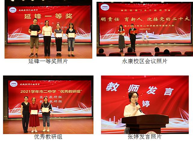 明确责任,培育新人,旌善扬清,薪火相传。本次教师节活动对教职工们一年里的精彩表现作出表彰,也为大家上一堂“开学第一课”、“入职第一课”。市二中学将以优异的成绩迎接党的二十大召开,也将以饱满的热情迎接建校百廿周年纪念活动的到来。