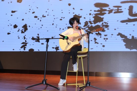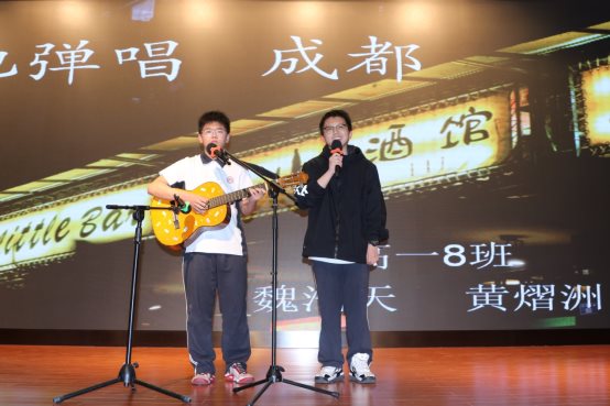 第五个节目高一8班崔雪菲、魏浩天、黄熠洲的吉他弹唱,演唱者优美的歌喉与动听的吉他声获得了同学们的一致好评。