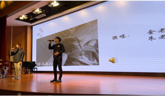 最后的节目同学们最为期待的教师表演,在全场欢呼和掌声中,教师代表朱老师和金禛老师隆重登场,他们带来一首歌曲《给你给我》,歌声交错着神奇、优雅、飘渺的音符,台下观众一起欢呼。
