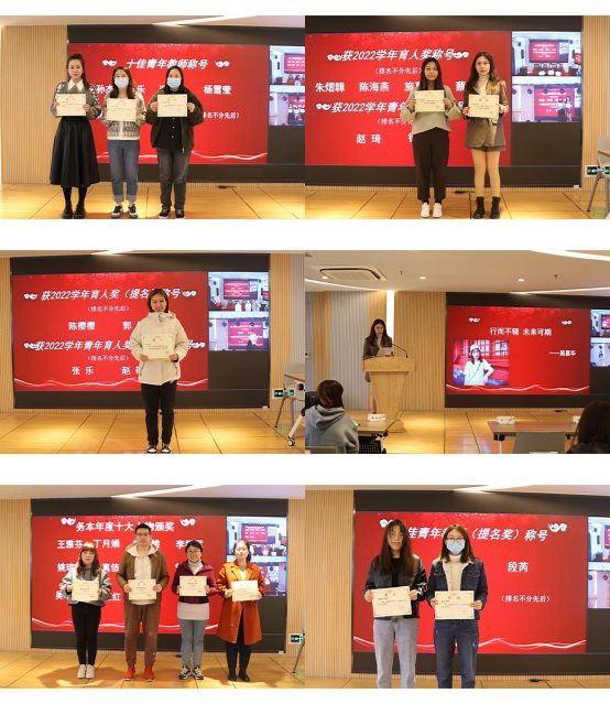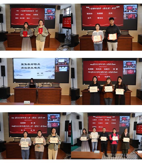 同时,获得“2022学年育人奖”的是朱熠韡老师、陈海燕老师、施嘉华老师、蔡蕾老师,荣获“2022学年青年育人奖”称号的是赵琦老师、钱蔚玲老师。他们用爱心润物无声,用点石成金的力量,将学生的潜能激发出来,浇灌他们茁壮成长。他们不仅是在教育领域里的耕耘者和忘我者,更是学校的耀眼明星。陈樱樱老师、郭倩老师荣获“育人(提名奖)”称号,张乐老师、赵艳老师荣获“2022学年青年育人(提名奖)”称号。陆军校长、吴卫副校长、政教主任李拥军老师、教导副主任许敏老师分别在两个校区为获奖教师颁奖。